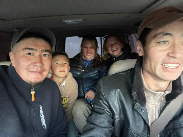 The next day I really did stick to the road and not the mountains, doing 10 miles to and through the town and waited 45 minutes until someone picked me up to hitchhike back to Ulgii. The man that picked me up drove a CRANK START engine. It was a crazy old Russian-jeep-looking car, and there were already two people in the passenger seat and four adults in the back plus a newborn. We listened to awesome Russian/Kazakh folk and bounced over the holes for a couple hours before they dropped me off.